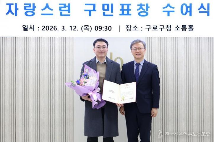 전국신문언론노동조합 강찬희 기자 | 구로구가 12일 구청 소통홀에서 구민의 생명 구조에 기여한 정귀현 씨에게 ‘자랑스러운 구민표창’을 수여했다.