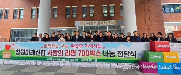 전국신문언론노동조합 강찬희 기자 | 창원시특례시는 12일 경남사회적경제혁신타운 중앙광장에서 창원미래신협이 (사)경남사회적기업협의회 창원지부에 관내 취약계층을 위한 라면 700박스 기탁 행사를 진행했다고 밝혔다.