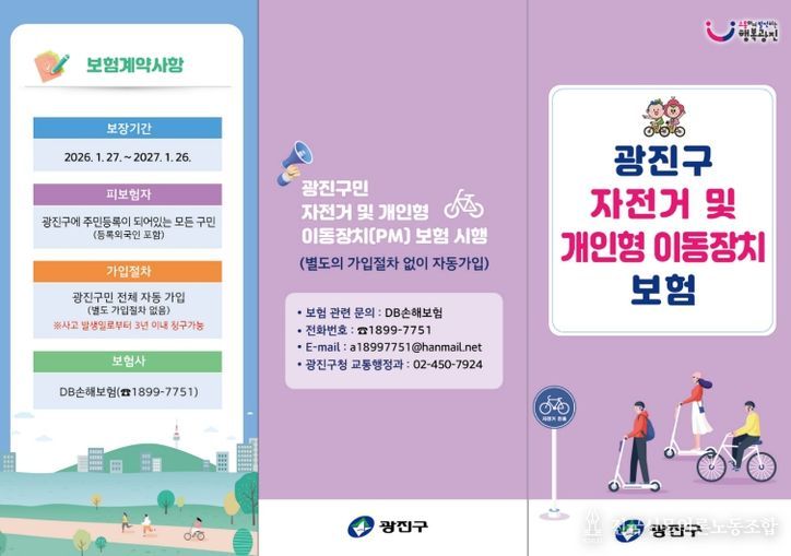 전국신문언론노동조합 강찬희 기자 | 광진구가 자전거와 개인형 이동장치 사고 발생 시 경제적 부담을 줄이기 위해 구민 단체보험을 운영하여 구민 안전망 강화에 나서고 있다.