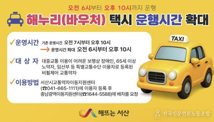 전국신문언론노동조합 강찬희 기자 | 충남 서산시는 오는 3월 16일부터 해누리(바우처) 택시 운행시간을 기존보다 1시간 확대 운영한다고 밝혔다.