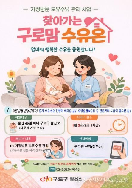 전국신문언론노동조합 강찬희 기자 | 구로구가 출산 초기 산모의 모유수유 부담을 덜기 위한 방문형 지원사업을 새롭게 추진한다.