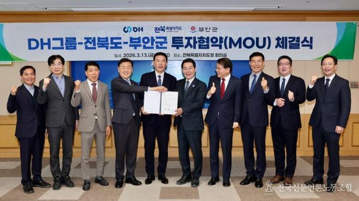 전국신문언론노동조합 강찬희 기자 | 부안군은 전북특별자치도와 함께 13일 전북특별자치도청에서 ㈜DH그룹과 1500억원 규모의 부안 제3농공단지 투자협약(MOU)을 체결했다고 밝혔다.