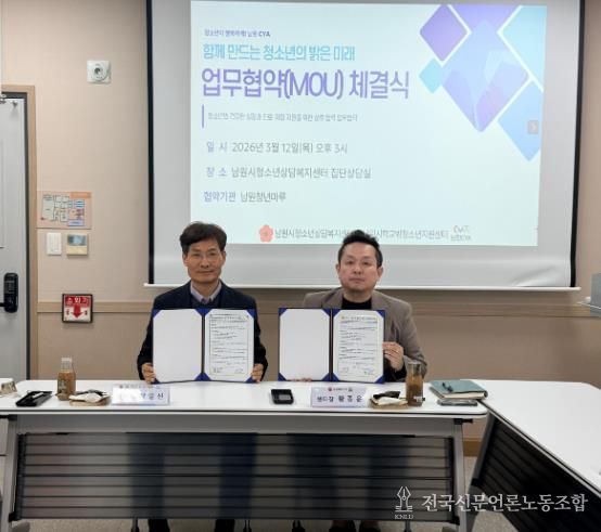 전국신문언론노동조합 강찬희 기자 | 남원시가 위탁하고 남원CYA가 운영하는 남원시학교밖청소년지원센터는 지난 12일 남원청년마루와 학교 밖 청소년의 건강한 성장과 자립 지원을 위한 업무협약(MOU)을 체결했다고 밝혔다.