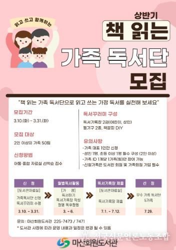 전국신문언론노동조합 강찬희 기자 | 창원시 마산회원도서관은 가족 독서문화 확산을 위해 ‘책 읽는 가족 독서단’을 운영하고 3월 10일 부터 3월 31일까지 상반기 참여 가족을 모집한다.