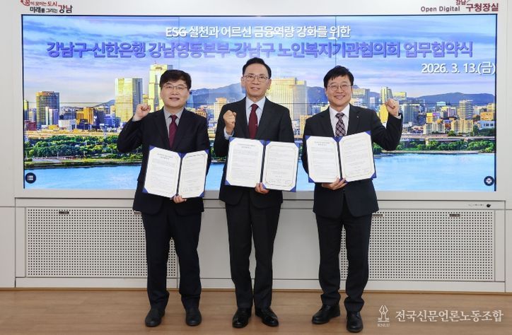 전국신문언론노동조합 강찬희 기자 | 꿈이 모이는 도시, 미래를 그리는 강남구가 13일 구청에서 ㈜신한은행 강남영동본부, 강남구 노인복지기관협의회와 3자 업무협약을 체결하고 어르신 금융역량 강화 교육을 추진한다. 이번 협약은 디지털 금융환경 변화에 따른 어르신들의 금융 소외를 예방하고, 보이스피싱 등 금융사고로부터 안전한 일상을 지원하기 위해 마련됐다.
