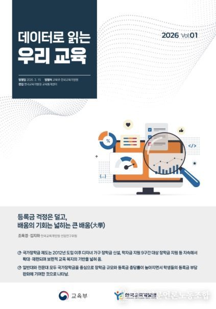 전국신문언론노동조합 강찬희 기자 | 교육부와 한국교육개발원(원장 고영선)은 3월 15일, 그동안 공표해 온 각종 교육 관련 통계와 공시자료를 주제별로 묶어 국민의 눈높이에서 해설한 「데이터로 읽는 우리 교육」을 발간한다.