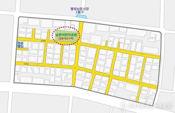 특히 대상지 중심에 위치한 남문어린이공원은 폐쇄적인 휴게공간과 급경사 계단 등의 환경 여건으로 이용이 불편하고 별빛남문시장이 인접해 음주‧주취 등으로 인한 주민 불안감이 높은 취약지다.