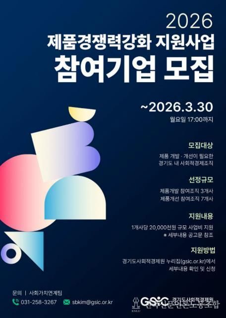 전국신문언론노동조합 김성길 기자 | 경기도와 경기도사회적경제원이 오는 30일까지 ‘제품 경쟁력 강화 지원사업’에 참여할 사회적경제조직을 모집한다.
