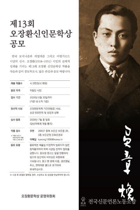 전국신문언론노동조합 김성길 기자 | 충북 보은군과 오장환 문학상 운영위원회는 한국 모더니즘과 리얼리즘, 아방가르드 시단의 선구자로 평가받는 오장환(1918~1951) 시인의 문학 정신을 기리고 유망한 신인 시인을 발굴하기 위해 ‘제13회 오장환 신인문학상’ 작품을 공모한다.