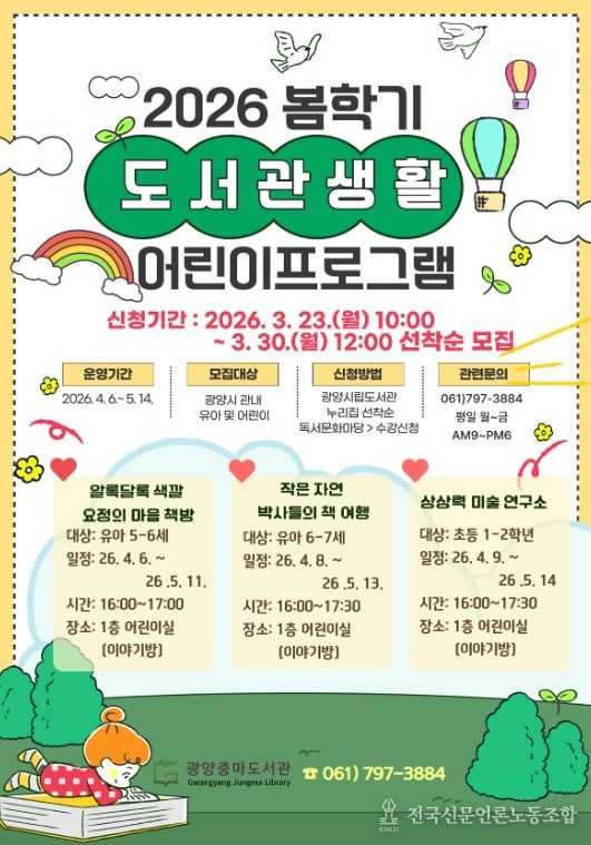 전국신문언론노동조합 강찬희 기자 | 광양중마도서관은 오는 4월 6일부터 5월 14일까지 6주간 유아(5~7세)와 초등학교 1~2학년을 대상으로 봄 학기 어린이 프로그램에 참여할 수강생을 모집한다고 밝혔다.