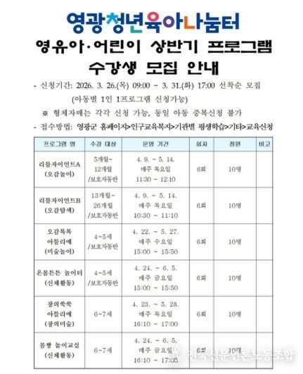 전국신문언론노동조합 강찬희 기자 | 영광군은 ‘영광청년육아나눔터’에서 영유아・어린이를 대상으로 하는 「2026년 상반기 프로그램」 수강생을 모집한다고 밝혔다.
