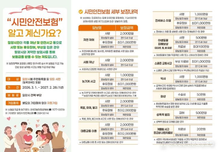 밀양시 관계자는 “시민안전보험은 예기치 못한 사고나 재난으로부터 시민의 생활 안정을 돕는 중요한 안전장치”라며 “올해는 보장 항목과 금액이 확대된 만큼, 더 많은 시민이 혜택을 누릴 수 있도록 적극적으로 홍보하겠다”고 말했다.