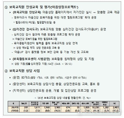 첫째, 중앙·지방 육아종합지원센터에 보육교직원의 보육활동을 보호·지원하는 전담조직을 둘 수 있도록 법적 근거를 마련했다. 이를 통해 보육교직원이 부당하게 보육활동 침해를 당하는 경우 전담조직을 통해 심리·법률지원 등 보호·지원을 받을 수 있도록 했다.