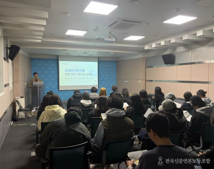 전국신문언론노동조합 강찬희 기자 | 전주시와 (사)전주영상위원회는 17일 전주정보문화산업진흥원 세미나실에서 지역 영화인과 영화 관련 단체 관계자, 관련 학과 전공 대학생 등 30여 명이 참석한 가운데 ‘2026 전주 영화·영상 지원사업 현장 설명회’를 개최했다.