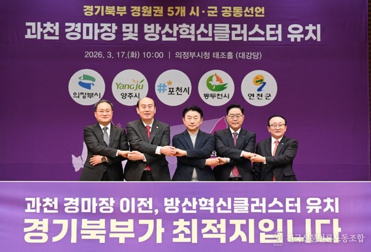 전국신문언론노동조합 강찬희 기자 | 양주시는 17일 의정부시청 대강당에서 의정부·포천·동두천시·연천군과 함께 ‘과천경마공원 이전 및 방산혁신클러스터 경기북부 유치’를 위한 공동 선언문을 발표했다.