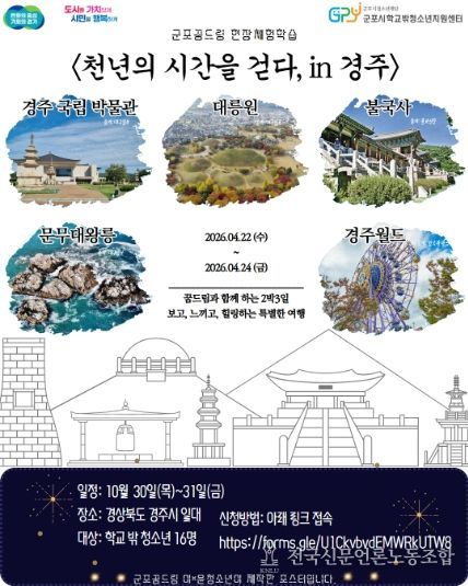 전국신문언론노동조합 김성길 기자 | (재)군포시청소년재단(대표이사 김덕희) 군포시학교밖청소년지원센터(센터장 강연미)는 학교 밖 청소년 16명을 대상으로 오는 4월 22일부터 24일까지 2박 3일간 경상북도 경주시 일대에서 ‘역사캠프 현장체험학습 프로그램’을 운영한다고 밝혔다. 참가신청은 구글폼 등을 통해 접수 받은 뒤 신청 내용을 바탕으로 참여 대상자를 선정할 예정이다.