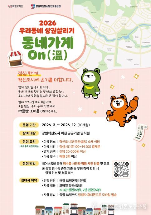 전국신문언론노동조합 강찬희 기자 | (재)강원혁신도시발전지원센터에서는 강원혁신도시 이전 공공기관 임직원을 대상으로 지역 상권 활성화를 위한 ‘2026 우리동네 상권살리기 동네가게 On(溫)’사업을 추진한다고 밝혔다.
