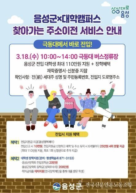 전국신문언론노동조합 김성길 기자 | 음성군이 새 학기를 맞아 18일 관내 대학인 극동대학교 캠퍼스를 직접 찾아가 학생들의 전입을 돕는 ‘찾아가는 주소이전 서비스’를 운영했다고 밝혔다.