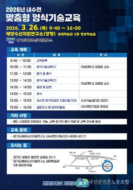 전국신문언론노동조합 김성길 기자 | 경기도해양자원연구소는 오는 26일 양평에 있는 연구소 생태학습관에서 내수면 양식 어업인의 역량 강화를 위한 양식기술교육을 실시한다.
