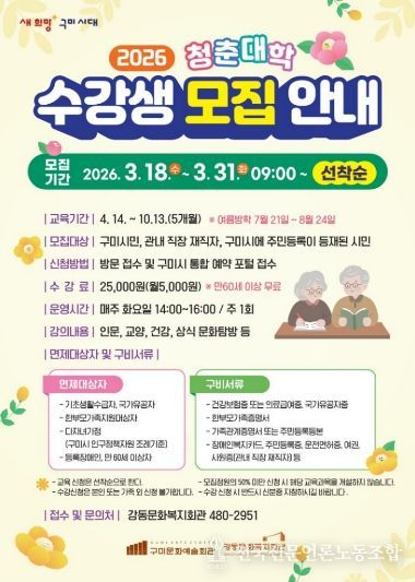 전국신문언론노동조합 강찬희 기자 | 구미시강동문화복지회관은 3월 18일부터 3월 31일까지 ‘청춘대학’ 수강생을 모집한다.