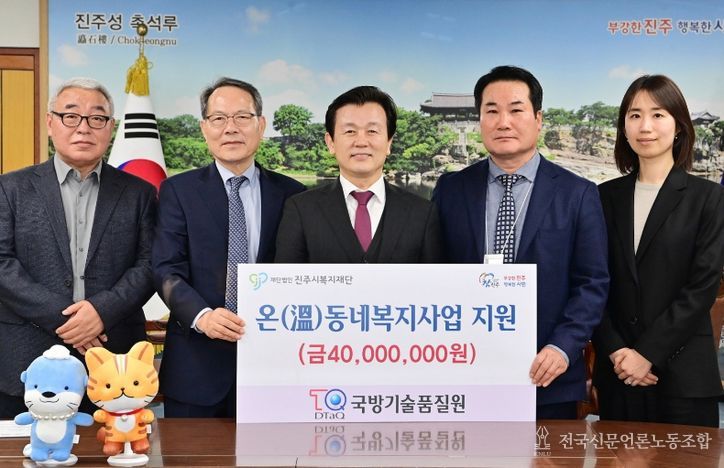 전국신문언론노동조합 강찬희 기자 | 국방기술품질원은 지난 17일 시청 기업인의 방에서 지역사회 어려운 이웃을 돕기 위해 성금 4000만 원을 진주시복지재단에 기탁했다.