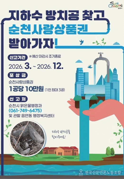 전국신문언론노동조합 강찬희 기자 | 순천시는 ‘방치공(소유자가 불분명하여 사용하지 않거나 관리되지 않아 위험이 커진 지하수 시설)’을 정비하기 위해 신고포상금제를 운영한다.