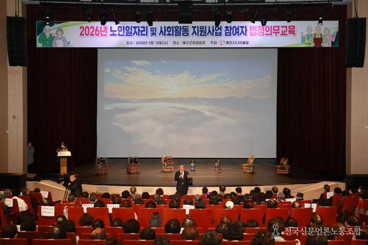 전국신문언론노동조합 강찬희 기자 | 예천군은 예천시니어클럽이 예천문화회관에서 노인일자리 및 사회활동 지원사업 참여자를 대상으로 18일 오전 9시부터 12시까지 법정의무교육을 실시했다고 밝혔다.