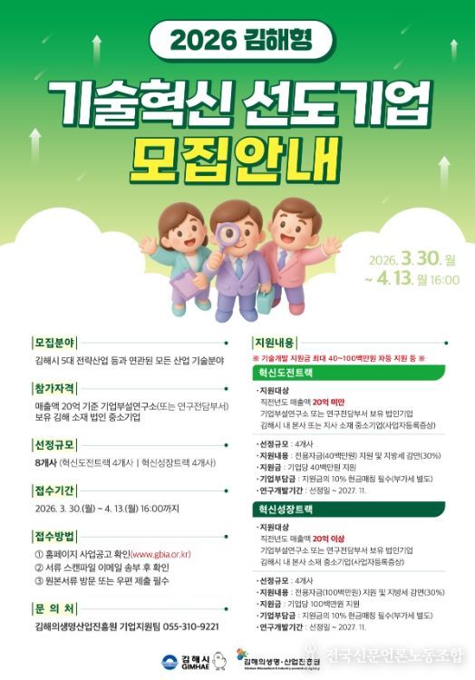 전국신문언론노동조합 강찬희 기자 | 김해의생명산업진흥원은 지역 중소기업의 연구개발 역량을 단계별로 지원하는 '2026년 김해형 기술혁신 선도기업 육성사업'을 추진하고, 참여기업 모집에 나선다고 밝혔다.