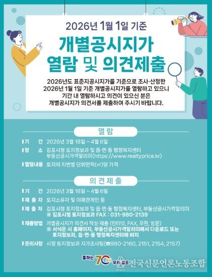 전국신문언론노동조합 김성길 기자 | 김포시는 2026년 1월 1일 기준 개별공시지가(안)에 대하여 오는 3월 18일부터 4월 6일까지 열람을 실시하고 토지소유자 및 이해관계인의 의견을 접수한다고 밝혔다.