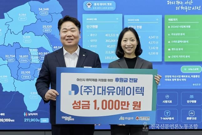 전국신문언론노동조합 강찬희 기자 | 아산시는 18일 ㈜대유에이텍으로부터 지역 내 취약계층 아동 지원을 위한 성금 1천만 원을 기탁받았다.