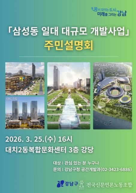 전국신문언론노동조합 강찬희 기자 | 꿈이 모이는 도시, 미래를 그리는 강남구가 오는 3월 25일 오후 4시, 대치2동복합문화센터 3층 강당에서 ‘삼성동 일대 대규모 개발사업 주민설명회’를 개최한다.