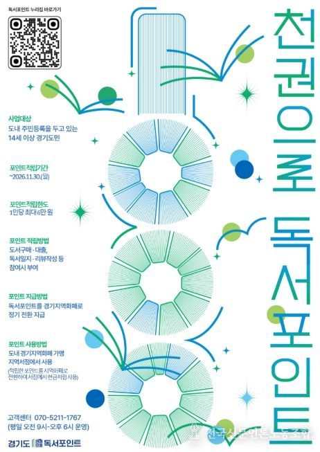 전국신문언론노동조합 김성길 기자 | 경기도가 도민 독서 습관 형성과 지역서점 이용 확대를 위한 ‘천권으로 독서포인트’ 사업을 개편했다. 적립 한도와 사용처를 확대하고 인증 절차를 간소화한 것이 핵심이다.