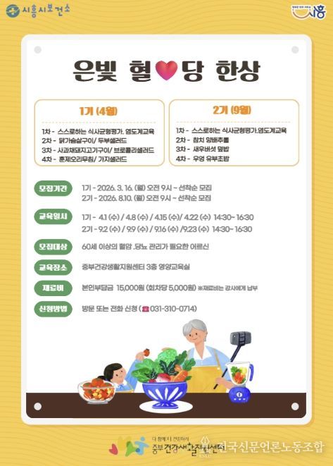 전국신문언론노동조합 김성길 기자 | 시흥시보건소 중부건강생활지원센터는 고혈압과 당뇨 관리가 필요한 어르신의 건강한 식생활 실천을 돕기 위해 영양교육 프로그램 ‘은빛 혈당 한상’을 4월 1일부터 센터 영양교육실에서 운영한다.