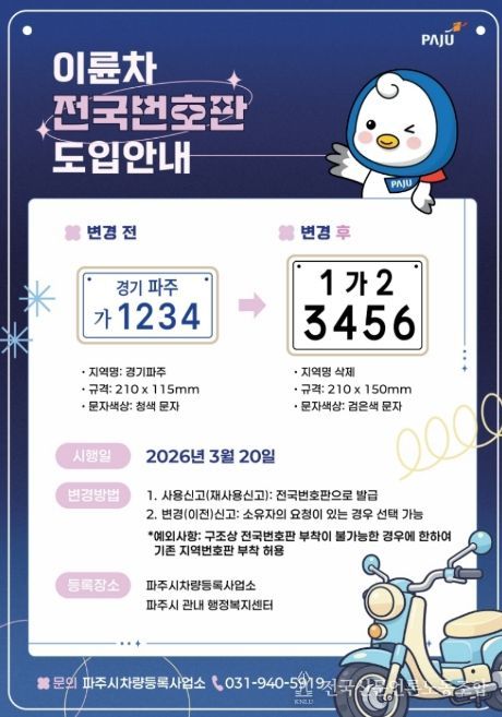 전국신문언론노동조합 김성길 기자 | 파주시는 오는 20일부터 이륜차 전국번호판 제도를 본격 시행한다.