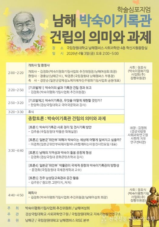 전국신문언론노동조합 강찬희 기자 | 경상국립대학교 사회과학연구원(원장 송원근 경제학부 교수)은 박숙이평화기림사업회 추진위원회(위원장 김정화 남해여성회장) 등과 함께 4월 3일 오후 2~5시 국립창원대학교 남해캠퍼스 사회과학관 4층 혁신지원융합실에서 ‘남해 박숙이기록관 건립의 의미와 과제’를 주제로 학술심포지엄을 개최한다.