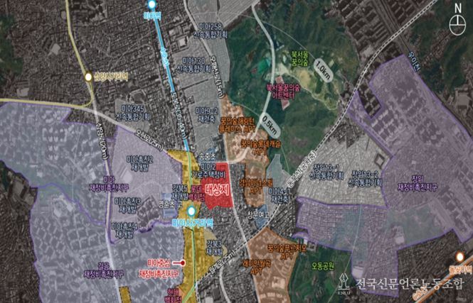 전국신문언론노동조합 강찬희 기자 | 지하철 4호선 미아사거리역 롯데백화점 뒤 300m 역세권에 최고 높이 45층, 1,600세대 대규모 아파트 단지가 들어선다.