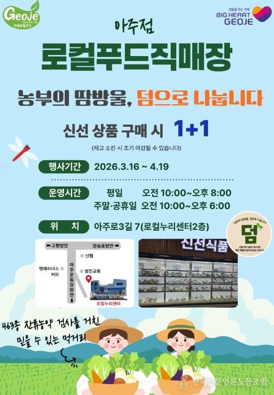 전국신문언론노동조합 강찬희 기자 | 거제시는 지난 16일부터 오는 4월 19일까지 약 1개월간 거제로컬 누리센터 아주점에서 농가의 재고 부담을 덜고 소비자에게는 혜택을 제공하는 『농부의 땀방울, 덤(1+1)으로 나눕니다』 행사를 시범 운영한다고 밝혔다.