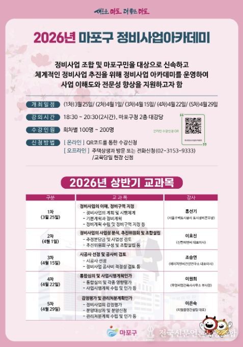 전국신문언론노동조합 강찬희 기자 | 마포구는 지역 내 정비사업 조합과 주민을 대상으로 ‘2026년 상반기 마포구 정비사업 아카데미’를 3월 25일부터 4월 29일까지 총 5회차에 걸쳐 개최한다.