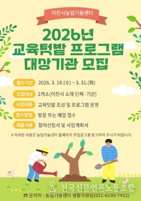 전국신문언론노동조합 김성길 기자 | 이천시는 도시농업 기반 조성 및 활성화를 위해 2026년 도시농업 교육텃밭 프로그램 대상자를 3월 31일까지 모집한다고 밝혔다.