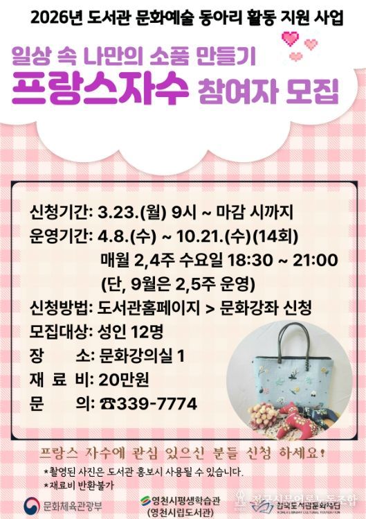 프랑스 자수 동아리는 올해 4월부터 10월까지 운영되며, 이달 23일부터 시립도서관 홈페이지에서 참여 신청을 받는다.