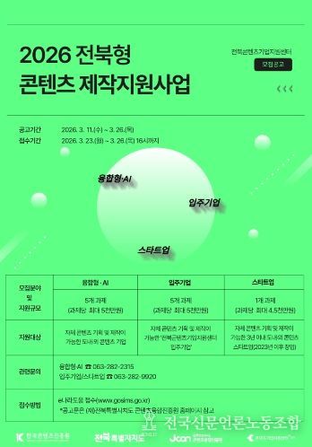 전국신문언론노동조합 강찬희 기자 | 전북도의 콘텐츠와 ICT 융합산업 육성을 이끌어가는 (재)전북특별자치도 콘텐츠융합진흥원에서 도내 콘텐츠 기업의 경쟁력 강화와 콘텐츠산업 활성화를 위해 ‘2026 전북형 콘텐츠 제작지원사업’과 ‘2026 콘텐츠 고도화 지원사업’ 참여기업을 모집한다고 밝혔다.