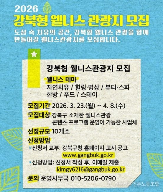전국신문언론노동조합 강찬희 기자 | 서울 강북구가 지역 내 숨은 관광자원을 체계적으로 발굴하고 육성하기 위해 ‘강북형 웰니스 관광지’ 공모에 나선다.