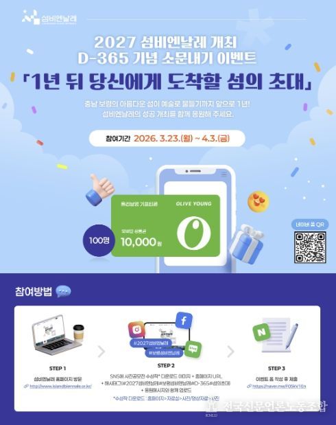 전국신문언론노동조합 강찬희 기자 | 섬비엔날레조직위원회는 3월 23일부터 4월 3일까지 약 2주간 섬비엔날레 개최 D-365일을 맞아 대국민 온라인 참여 이벤트를 진행한다고 밝혔다.