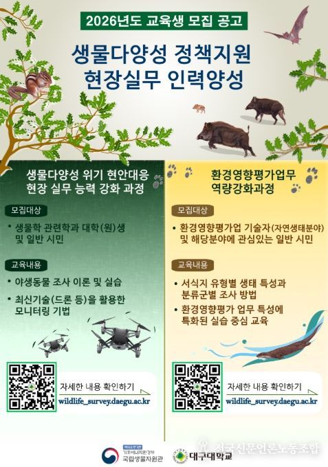 전국신문언론노동조합 강찬희 기자 | 기후에너지환경부 소속 국립생물자원관은 3월 24일부터 ‘2026년 생물다양성 정책지원 현장실무 인력양성’ 교육 참가자 110명을 모집한다고 밝혔다.
