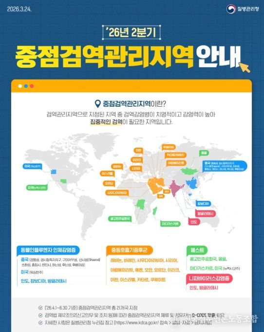 전국신문언론노동조합 강찬희 기자 | 질병관리청은 해외감염병 발생 동향과 위험평가를 바탕으로 2분기 중점검역관리지역과 검역관리지역을 지정·해제하고, 4월 1일 자로 시행한다.