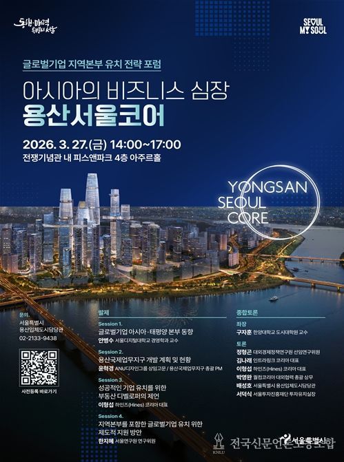 전국신문언론노동조합 강찬희 기자 | 서울시는 3월 27일 금요일 오후 2시 용산구 전쟁기념관 내 피스앤파크 컨벤션에서 용산국제업무지구 내 글로벌기업 지역본부 유치를 위한 전략을 모색하는 포럼을 개최한다.