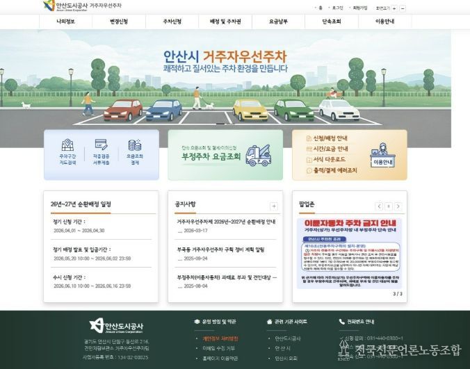 전국신문언론노동조합 김성길 기자 | 안산도시공사는 거주자우선주차장 운영 서비스를 전면 개편하고, 내달 1일부터 한 달간 ‘2026년 순환배정’ 신청을 접수한다고 24일 밝혔다.
