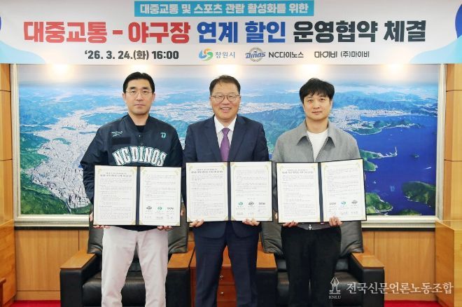 전국신문언론노동조합 강찬희 기자 | 창원특례시와 NC 다이노스, ㈜마이비는 24일 창원시청에서 시내버스-야구장 연계 할인 서비스 제공을 위한 업무협약을 체결했다.