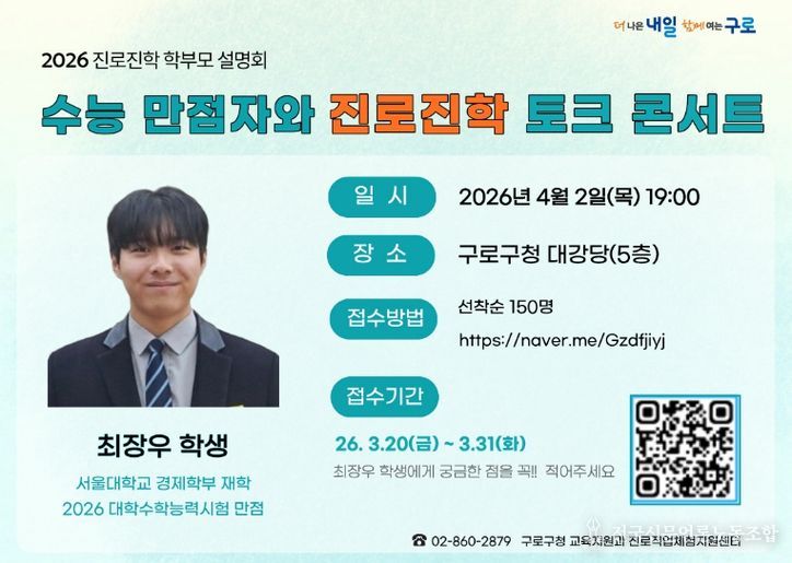 전국신문언론노동조합 강찬희 기자 | 구로구가 오는 4월 2일 구로구청 대강당에서 ‘2026 수능 만점자와 진로진학 토크콘서트’를 개최한다.