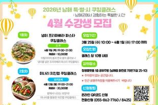 남해군 관계자는 “이번 쿠킹클래스를 통해 군민들이 봄 제철 식재료의 맛을 만끽하며 계절의 변화 속에서 힐링하는 시간을 가지시길 바란다”며 “앞으로도 군민들의 문화 향유 기회를 넓히고 일상에 활력을 더할 수 있는 다양한 체험 프로그램을 지속적으로 운영하겠다”고 밝혔다.